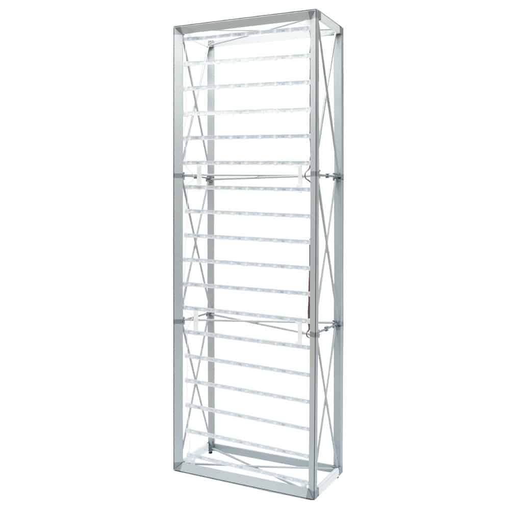 Illuminate your message with the Lumiere Light Wall! Lumiere LED ladder lights made back-lit graphics pop on this innovative combo display of silicone-edge graphics and portable RPL fabric pop ups. Plus the Lumiere shrinks down in size: simply collapse the geometric frame and the SEG bungeed channel bars, and fold or roll the fabric graphics. Setup can be done by one person in 25 minutes. SEG portability is easy and stylish. Multiple Lumiere Light Walls can be connected together to create a larger backwall. Using the drop down menu. No matter how many you connect, you’ll only need 1 pair of end caps.*Ladder lights are installed on one side of the frame only. Single and double-sided displays use the same quantity of lights. Lights do not need to be installed on the backside of the frame for double-sided graphics.*Hard case options will hold 1 frame w/bag, channel bars w/bags and a full set of LED ladder lights with transformers for frame sizes up to 10′ x 7.5′
